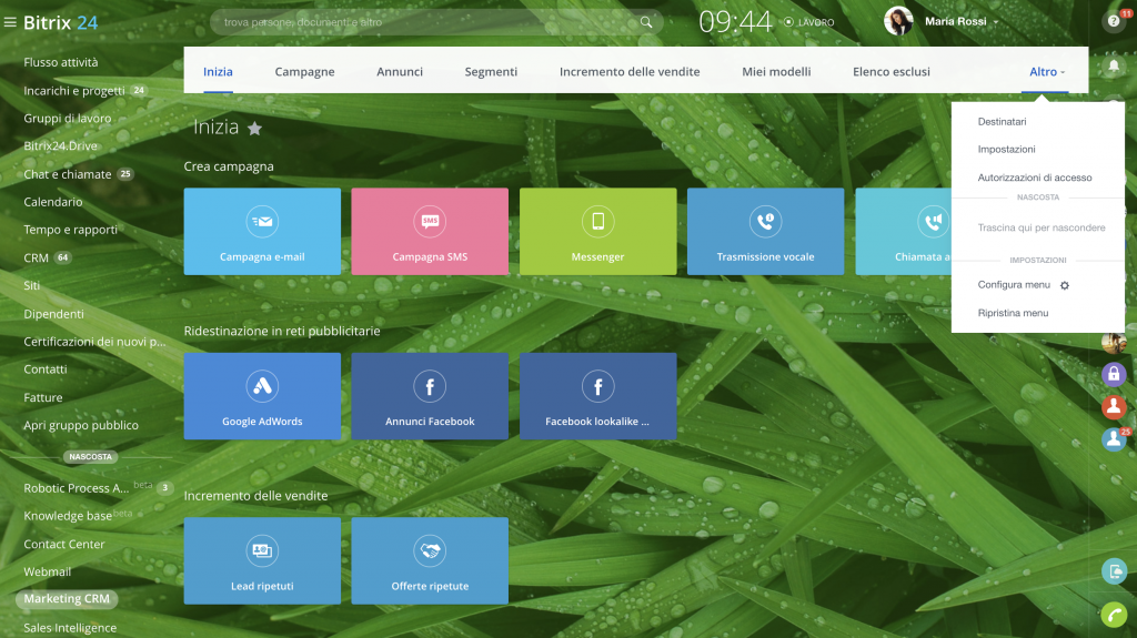 • Inizia - accesso alla pagina iniziale del Marketing CRM.