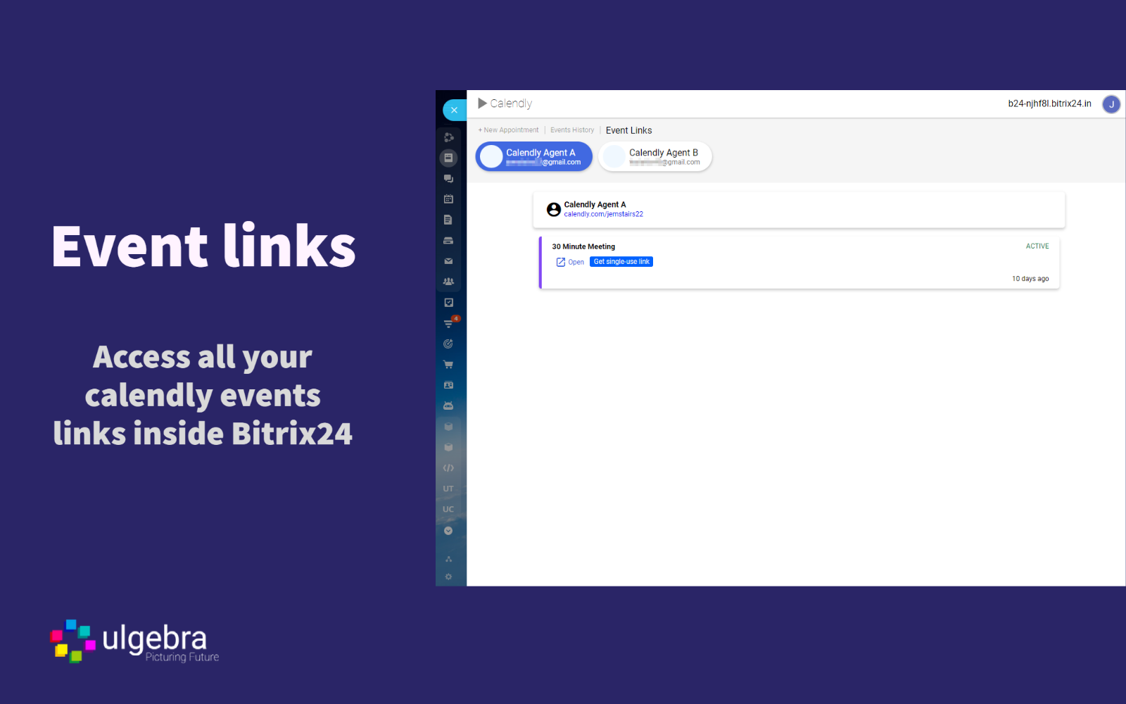 Open any Bitrix24 Lead, Contact or Deal and click on Calendly available on the panel on top. Click on 'Event Links' and select any Calendly agent. You can access the booking links of the particular agent and also create a single use link to be shared. Click on 'Get single-use link', copy the link received and share it with the required contact.