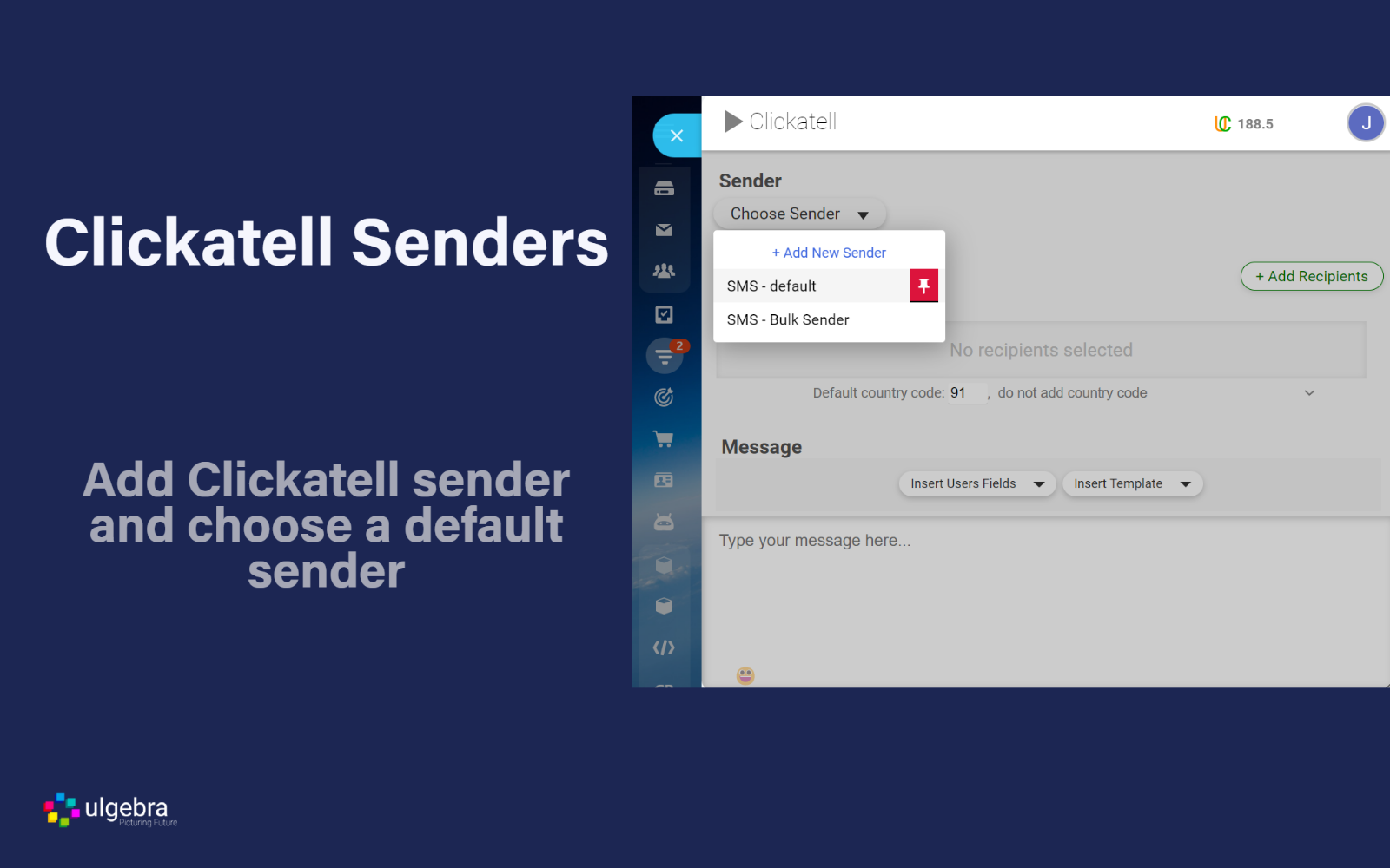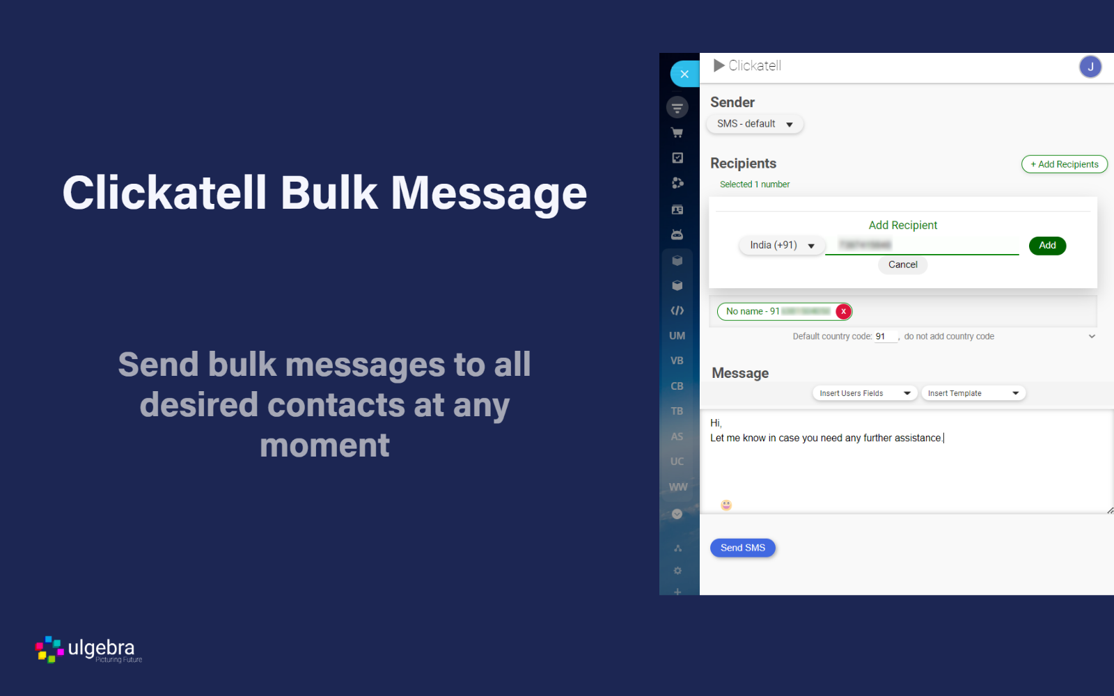 Sele ct Clickatell SMS for Bitrix24 fr om menu on the left side of the Bitrix24 CRM. Select the message sender and click on 'Add Recipients'. Select the country code and enter the contact number. Click on 'Add'. Similarly, add multiple contacts to send bulk message. Type in your message or ins ert templates. Add User Field and emojis if required. Click on 'Send SMS'.