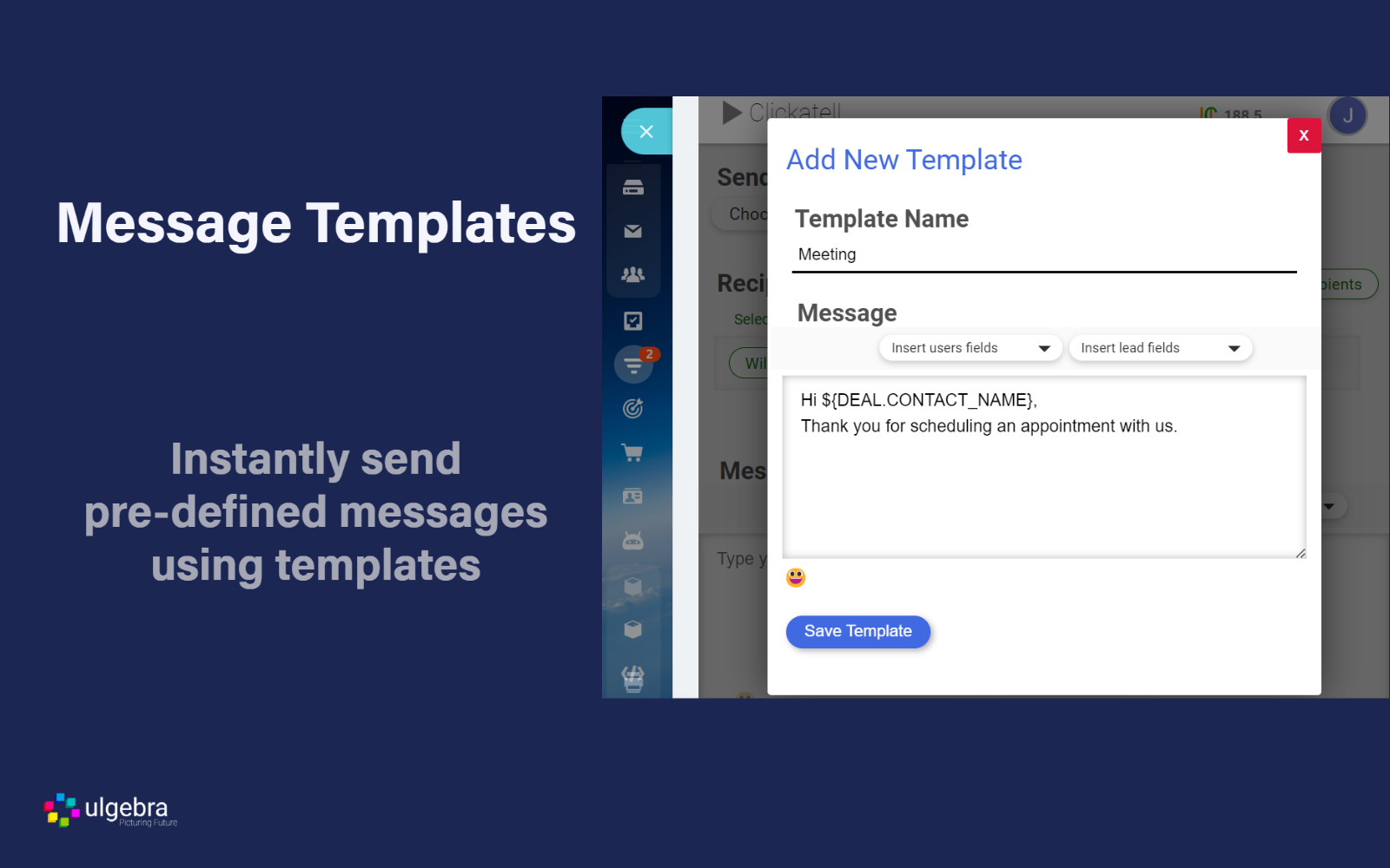 Open a Bitrix24 Lead, Contact or Deal and sel ect Clickatell fr om the panel on top. Sel ect the messaging sender. Click on 'Add Recipients' to include multiple contacts. Enter the required contact numbers. Enter the message or sel ect the required template. Ins ert Lead/Contact/Deal Fields, User Fields and emojis when required. Click on Send SMS.