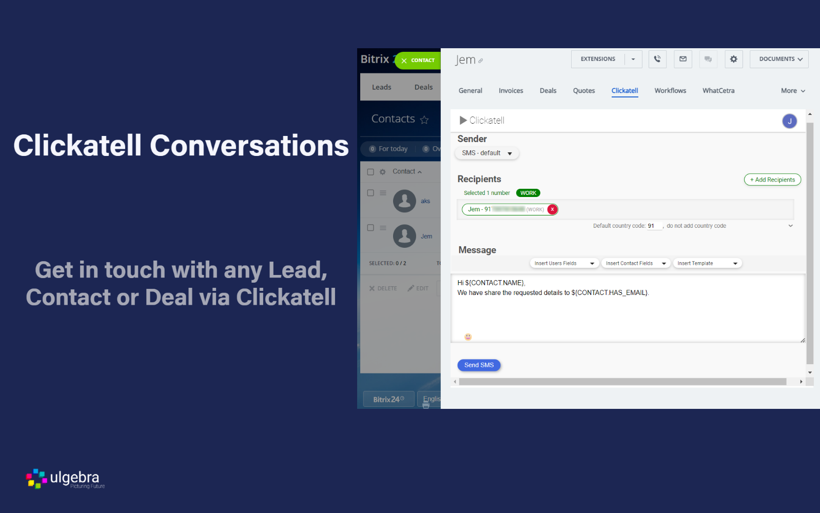 Open a Bitrix24 Lead, Contact or Deal and sel ect Clickatell fr om the panel on top. Sel ect the messaging sender. Click on 'Add Recipients' to include multiple contacts. Enter the required contact numbers. Enter the message or sel ect the required template. Ins ert Lead/Contact/Deal Fields, User Fields and emojis when required. Click on Send SMS.