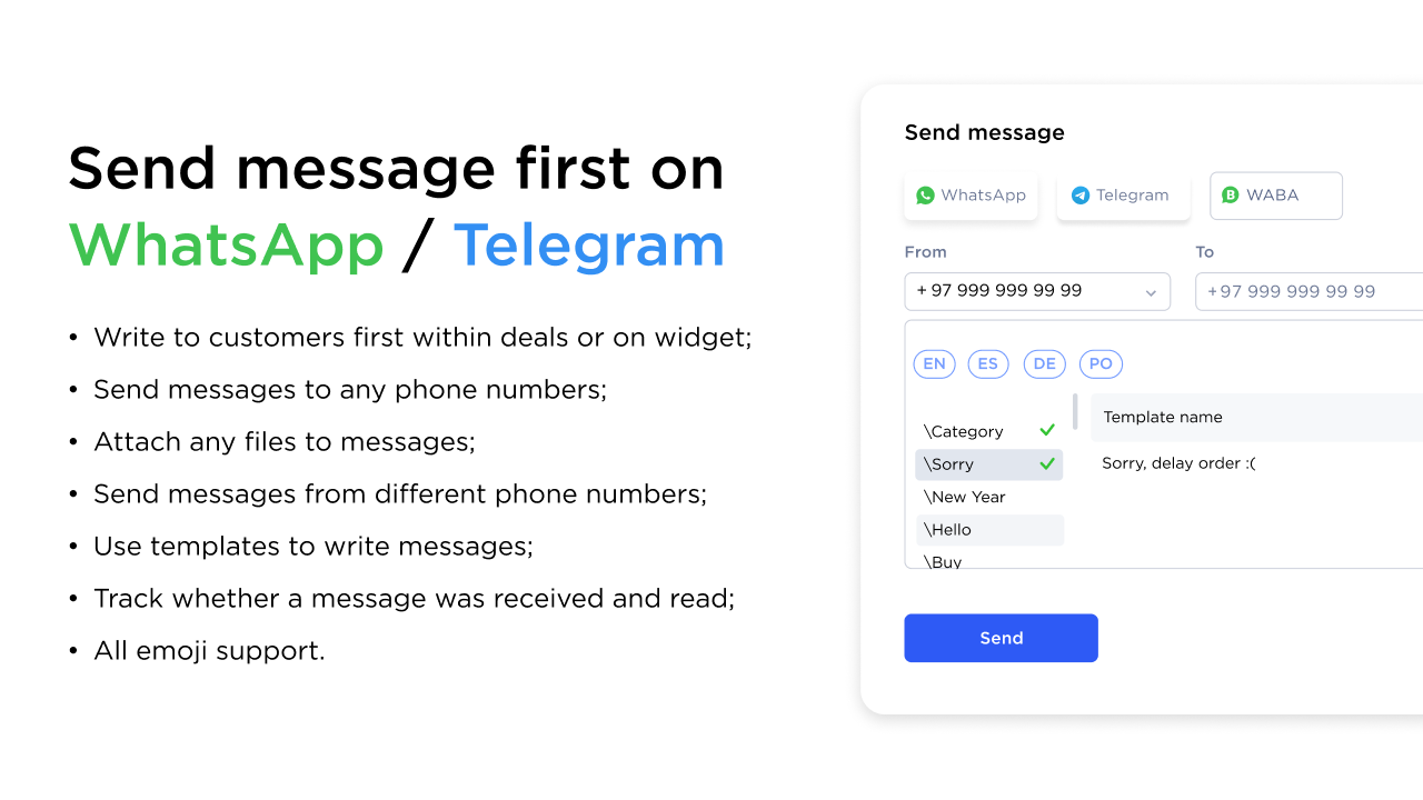If your sales or support team couldn't reach a client by phone, they can reach out to customers first on Telegram or WhatsApp from any deal card, using any number or username in the messenger. The message delivery status feature helps you understand if the client has read it.