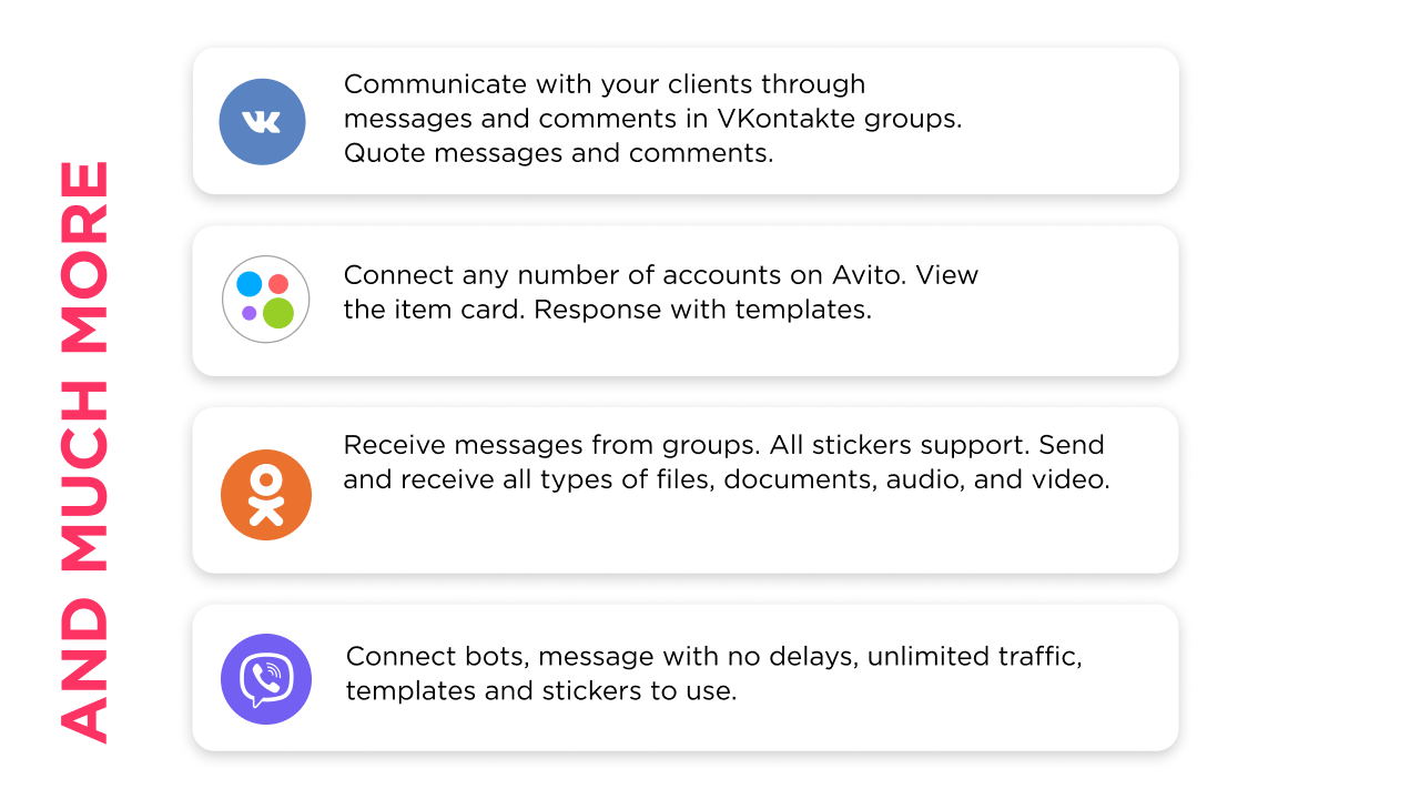 Saving all communication records within Bitrix24 allows you to quickly find the information you need in chats and helps to better evaluate the performance of your support and sales teams. Umnico enables you to connect any number of messenger and social media accounts through certified, high-quality mechanisms that prevent account blockages.