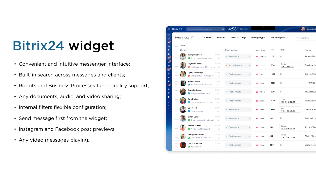 By installing theUmnico application for Bitrix24, you get the widest range of supported messengers and social media for Bitrix24, including: