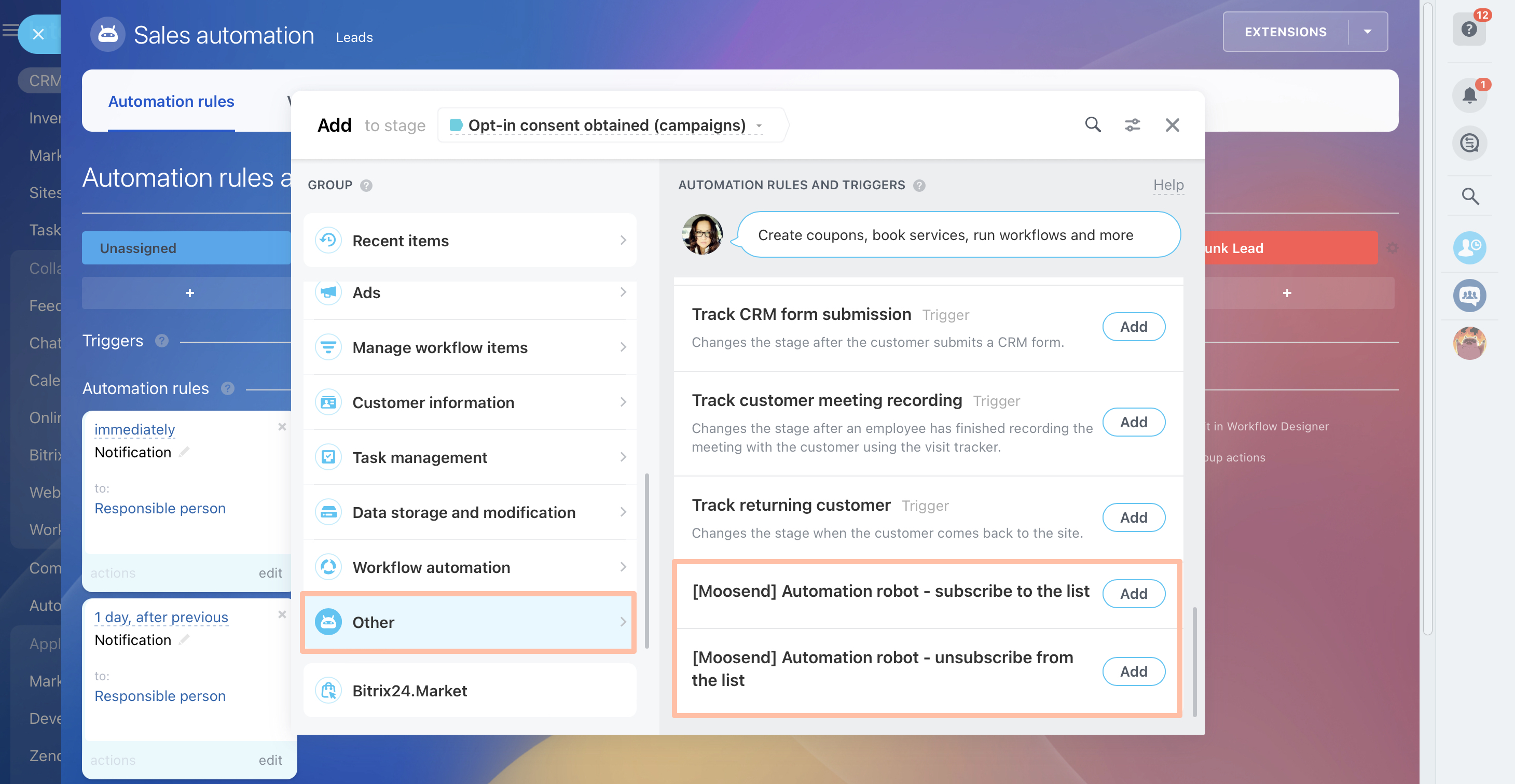 With our solution, all you need to do is configure the automation rule once in a suitable stage. That's it! And if any of your customers no longer wish to receive newsletters, you can easily unsubscribe them by dragging a lead or deal to the stage with this tule. It's the time-saving benefit you've always wished for.