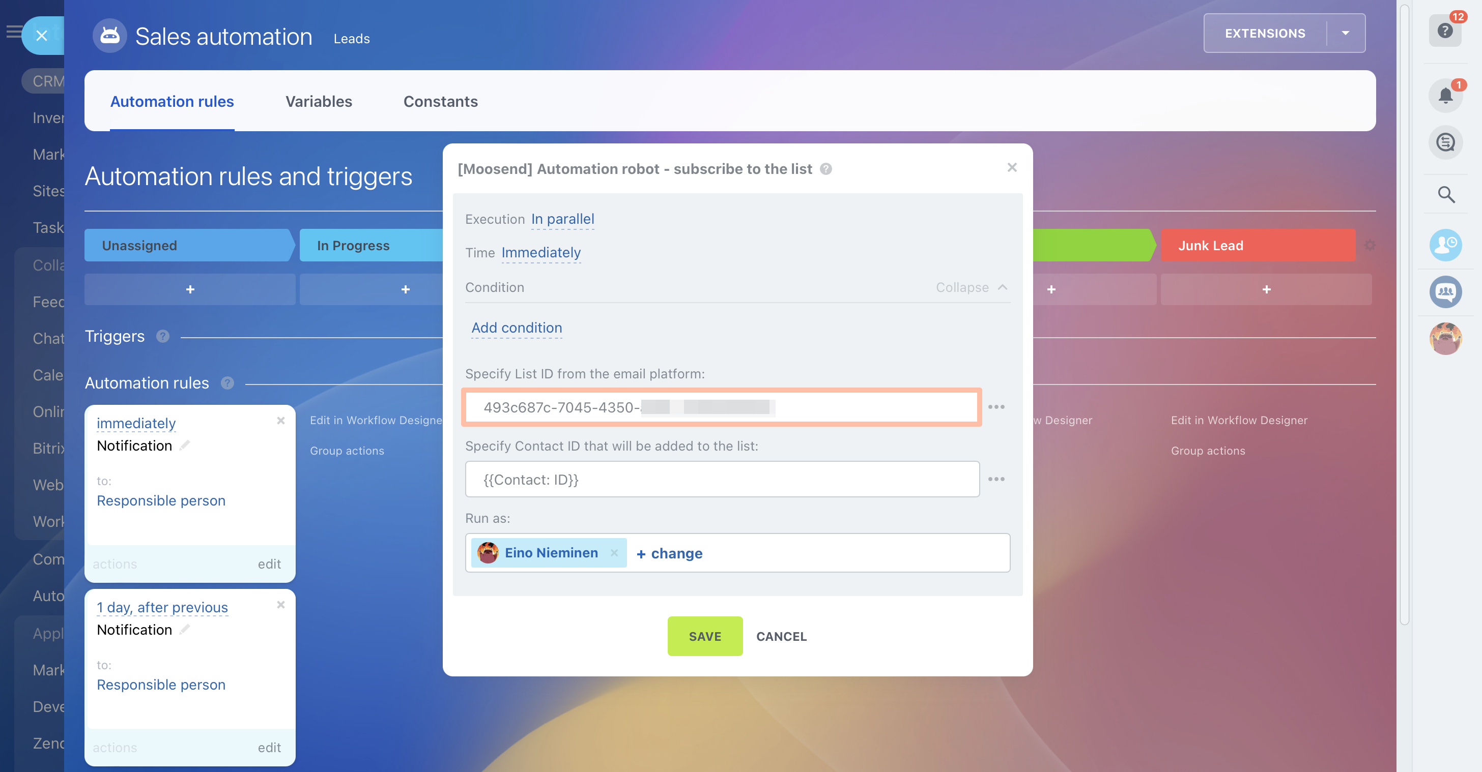 Moosend integration is designed to enhance your experience of managing marketing campaigns. With Bitrix24 custom automation rules, you can automate the entire process and save valuable time and effort. It is plain simple.