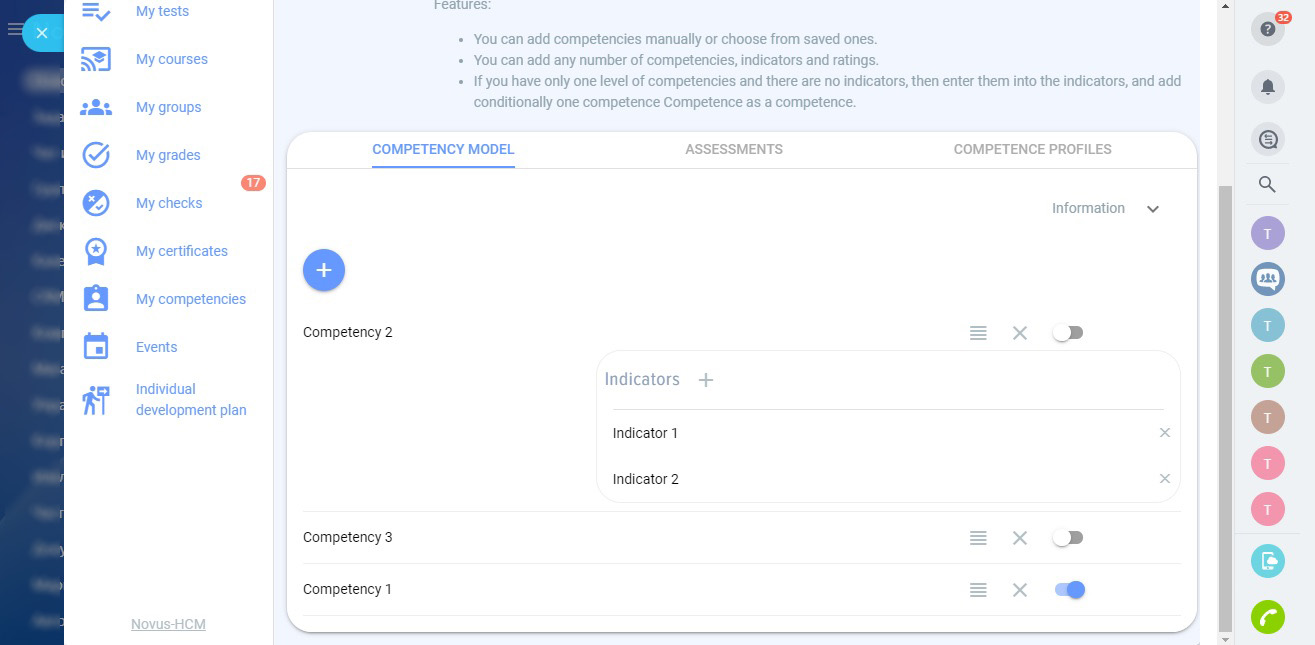 - Two model options: competency-indicators-assessments or competency-assessments Unlimited assessment scales