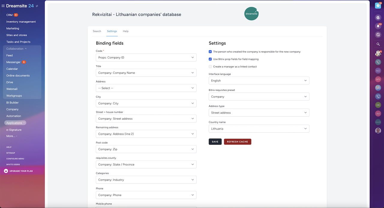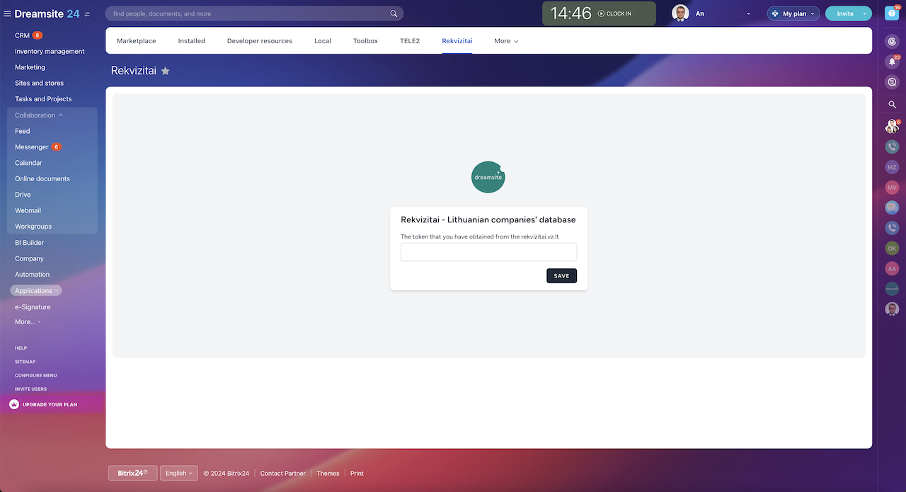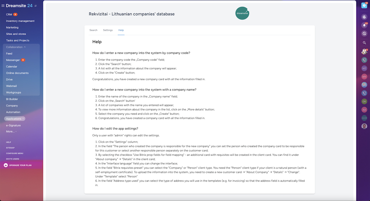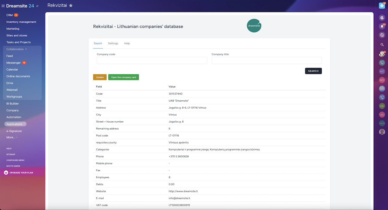 Get qualified information about the company registered in Lithuania directly into your Bitrix24 from rekvizitai.vz.lt. Add a company and it's details to your customers list within a minute.