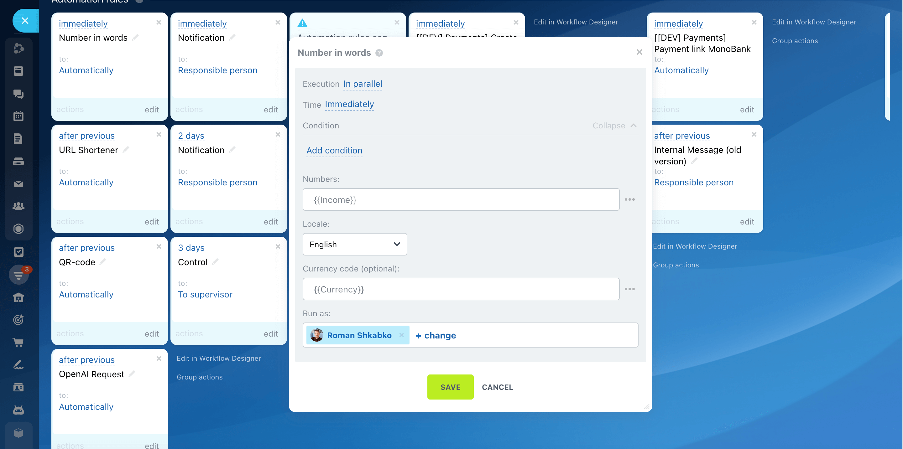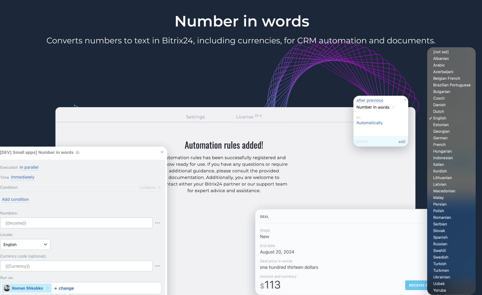 Working with contracts and invoices that require amounts in words? Our app automatically converts numbers to text and passes them as a variable in BPM. For example, when approving a deal of $113.70, the value 'one hundred thirteen dollars 70 cents' can be inserted into a document, notification, or used in automation scenarios.