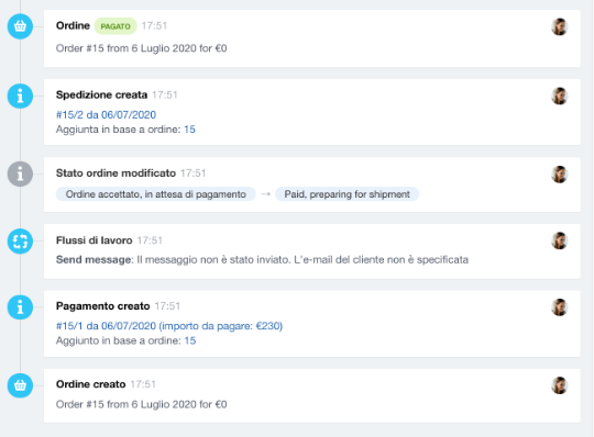 Crea un ordine, invia al cliente il link del pagamento e pianifica la consegna. Tutto all’interno del tuo CRM Store.