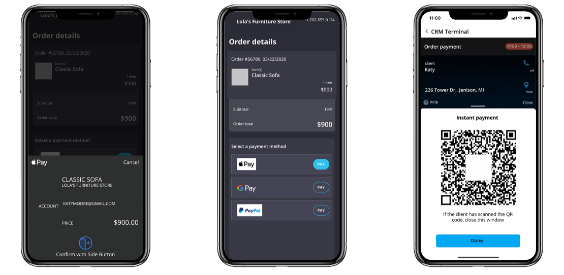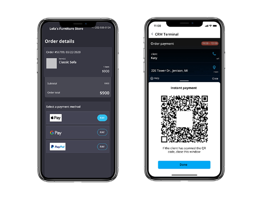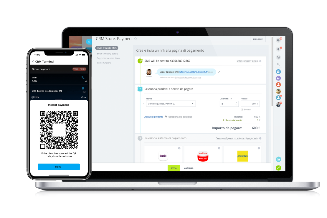 Offri ai tuoi clienti la libertà di scegliere. Con il CRM Store di Bitrix24 ci sono diversi metodi di pagamento: contanti, carta, PayPal, Apple Pay, Google Pay e altri metodi disponibili nel tuo paese.