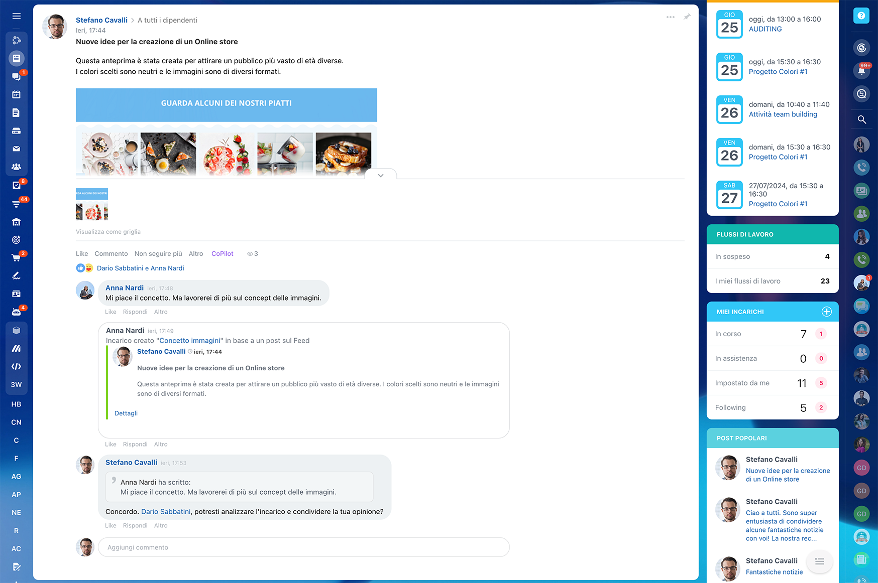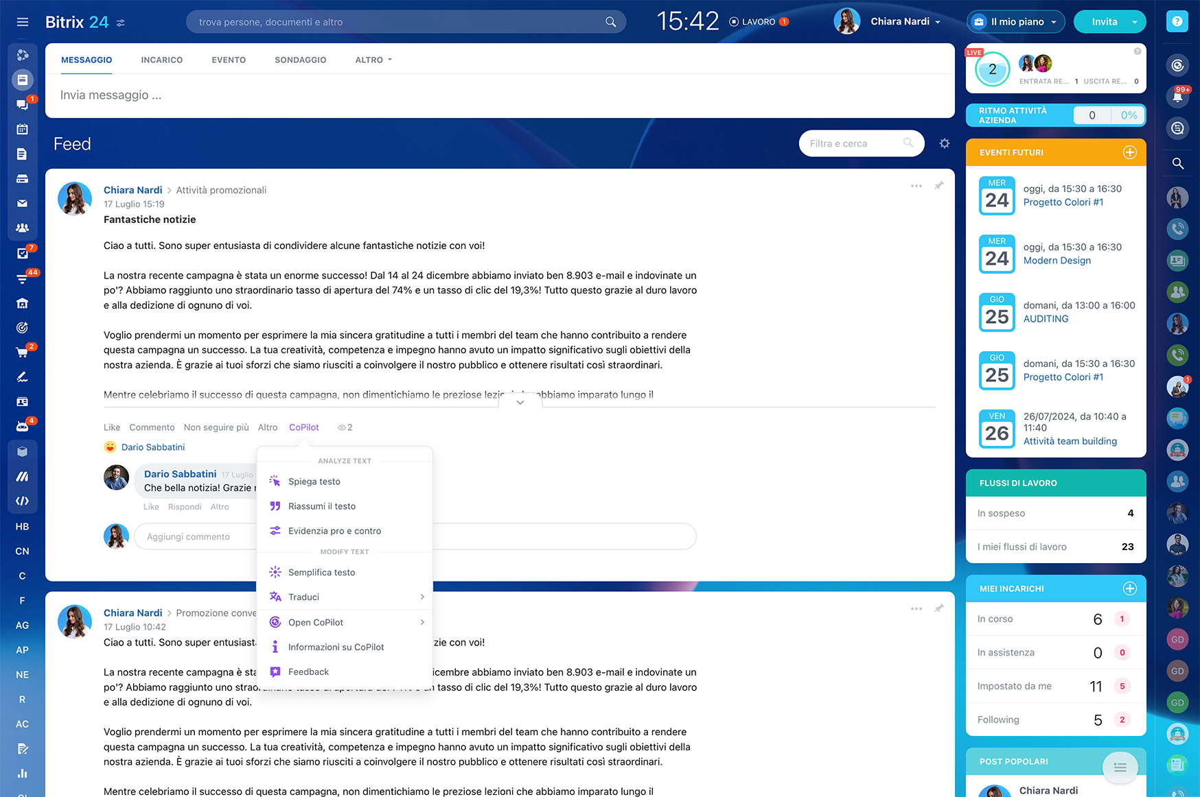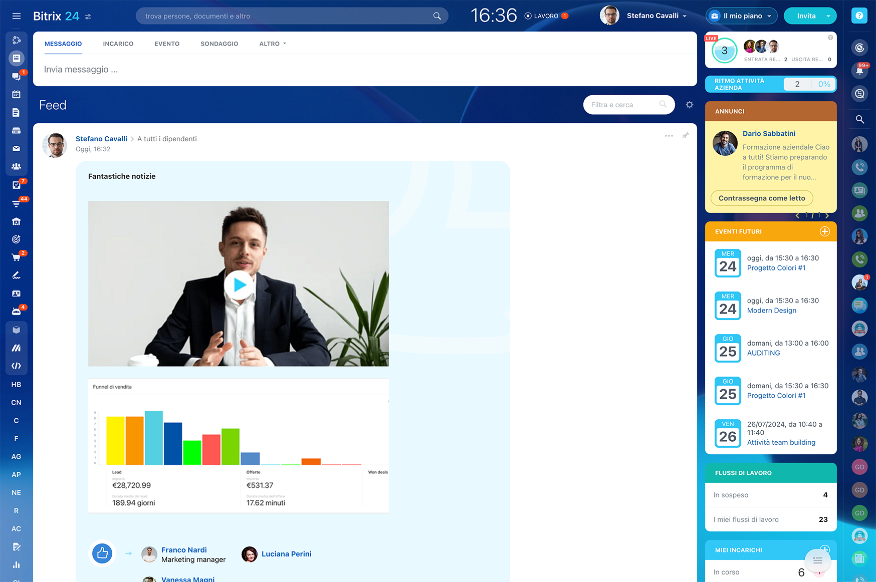 Nella piattaforma di collaborazione Bitrix24, il Feed è uno spazio in cui puoi leggere le notizie dell'azienda e del team, vedere gli annunci, partecipare a sondaggi e discussioni nei commenti oppure condividere un tuo post.