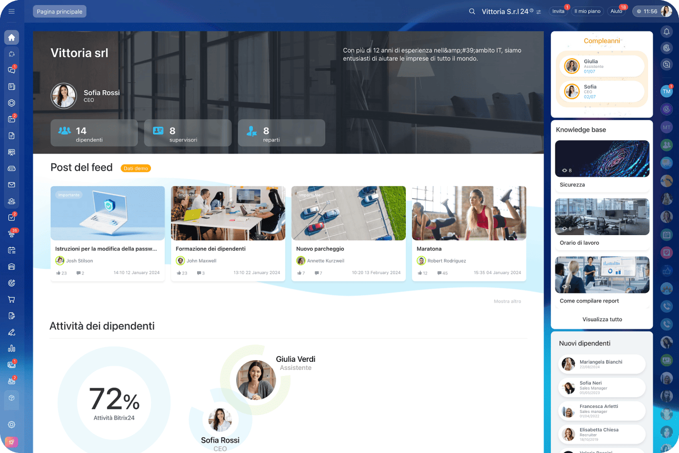 Basta un'occhiata alla pagina iniziale per avere una panoramica dell'attività dell'azienda. Grazie ai diversi tipi di widget, tra cui attività e compleanni dei dipendenti, puoi creare un ambiente accogliente sia per i dipendenti attuali che per i nuovi arrivati.