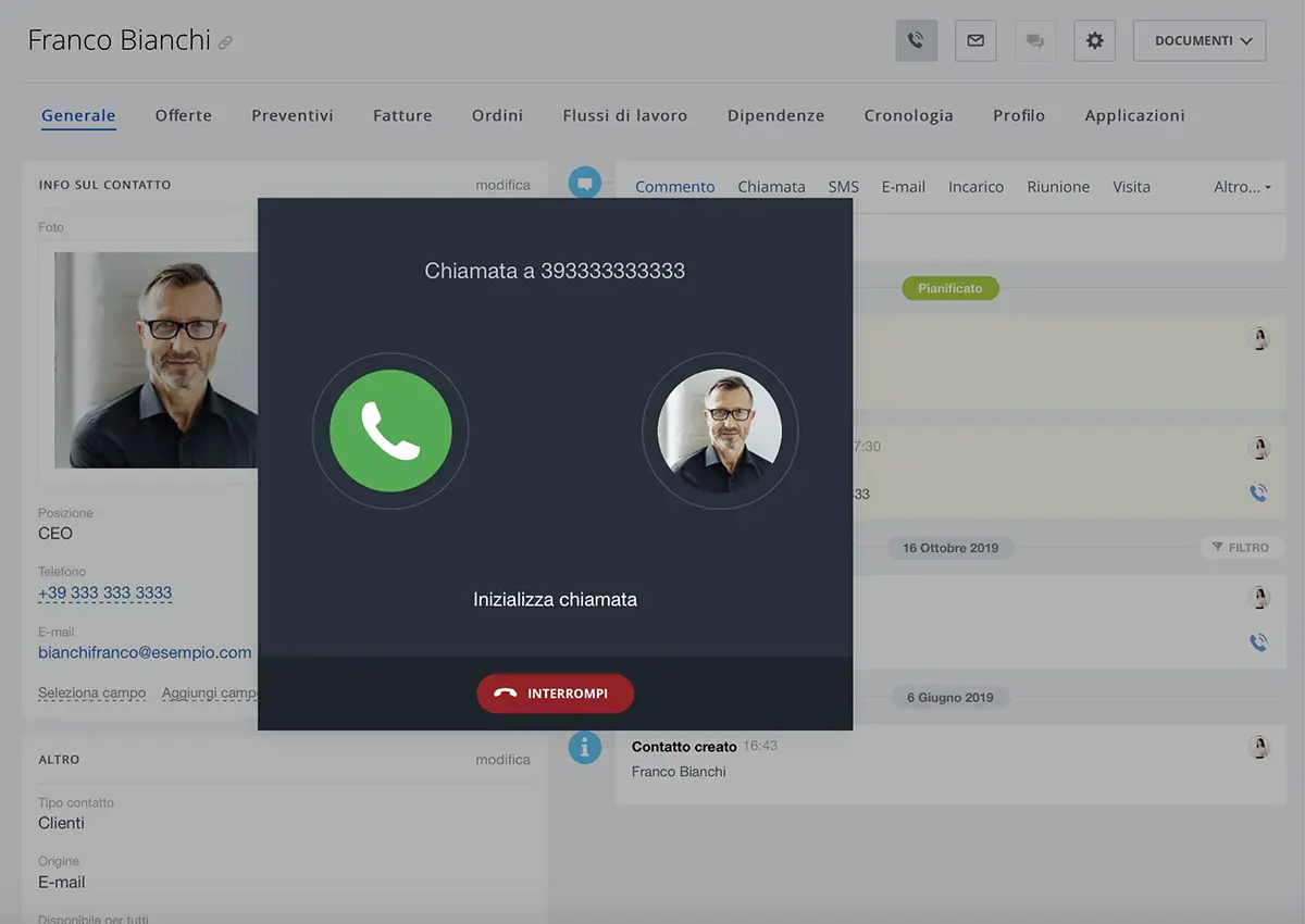 Le chiamate possono essere registrate e associate agli affari nel CRM. Le chiamate in arrivo vengono inoltrate al rappresentante commerciale responsabile di ciascun particolare lead.