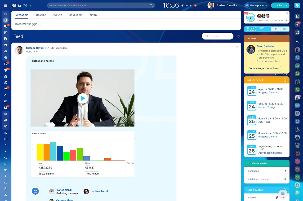 Nel software di Bitrix24 per gli annunci, il feed è il luogo in cui puoi leggere le notizie dell'azienda e del team, vedere gli annunci, partecipare a sondaggi e discussioni nei commenti oppure condividere un tuo post con determinati membri del team o con l'intera azienda.