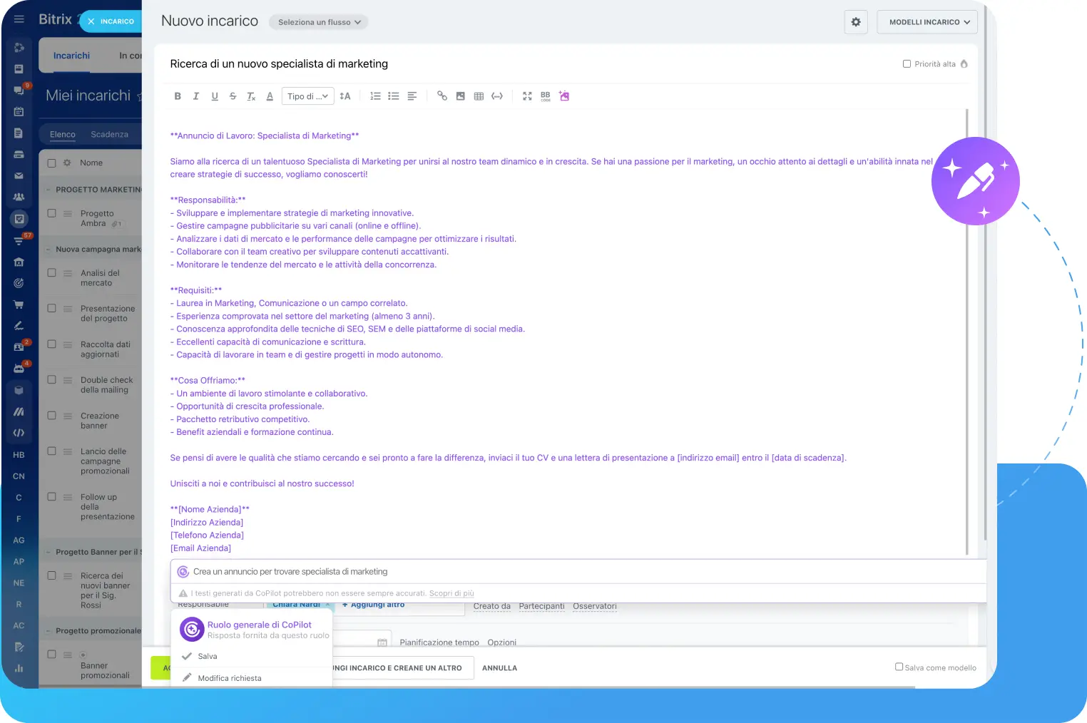 Usa CoPilot di Bitrix24 per generare descrizioni degli incarichi, pianificare progetti, creare riepiloghi degli incarichi, rispondere ai commenti e altro.